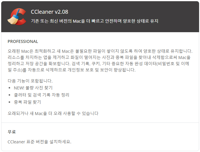 무료 버전은 공간을 확보하고 온라인 트랙을 지우며 컴퓨터를 관리하여 더 빠르게 작동하도록 도와줍니다.