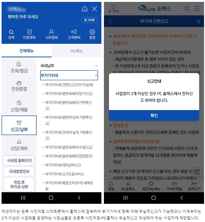 스마트폰에서 2023년 부터는 무실적신고를 위한 홈택스 부가세신고가 되지 않습니다. 사업장이 2개 이상인 경우 PC 앞에 앉아서 작성해야 만 합니다. 어디가 어떻게 바뀌었는지 확인하고 10분안에 부가가치세 신고를 마무리해 보겠습니다.
